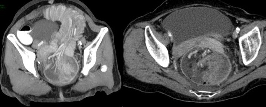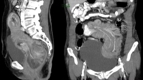 Se presenta el caso de una paciente femenina de 71 años, que ingresa por guardia con dolor abdominal en fosa iliaca derecha y deposiciones diarreicas sanguinolentas. Al examen físico, abdomen blando depresible, con masa palpable, y doloroso a la palpación en FID. En la TC de abdomen y pelvis con contraste oral y EV se observó el pasaje del contraste oral hasta colon derecho. Ángulo derecho descendido de topografía, donde se observa área redondeada de engrosamiento parietal con realce. Distalmente se observa intususcepción, que compromete el resto de colon hasta el recto con ligero realce parietal en dichos segmentos en relación con hiperemia. No se observó dilatación de asas delgadas.