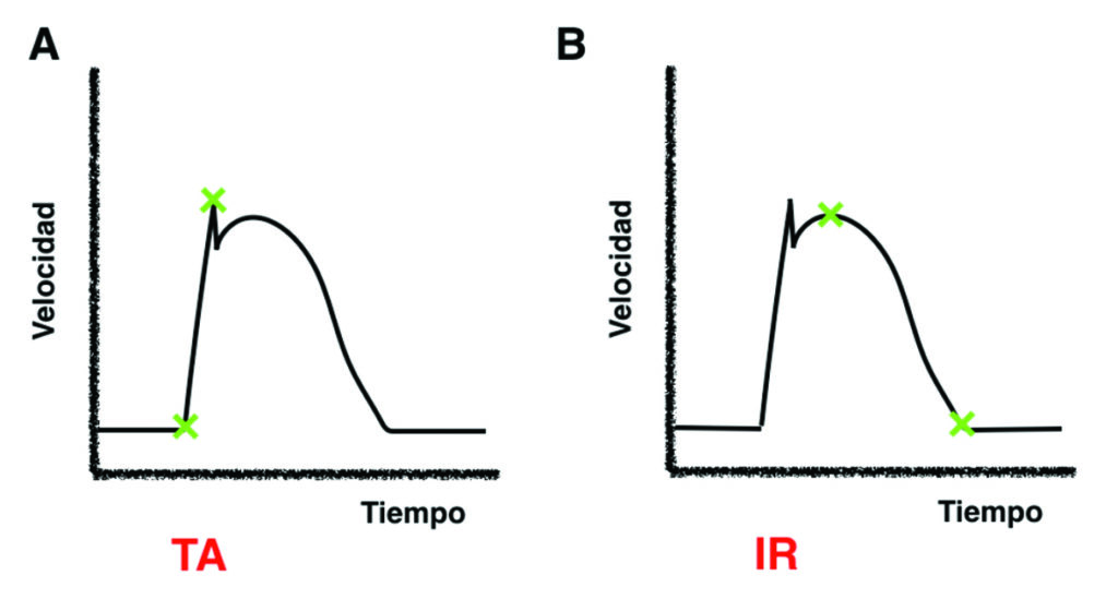 Determinación intrarenal. Los cambios en la forma de onda intrarenal son producto de la interacción entre la resistencia al flujo y la ductilidad arterial. Este fenómeno se traduce en el aumento del tiempo de aceleración (TA) y en la disminución del índice de resistencia (IR), parámetros que determinan indirectamente la presencia de estenosis. Realizando mediciones precisas (Fig. 1), el IR se calcula a partir de la fórmula: