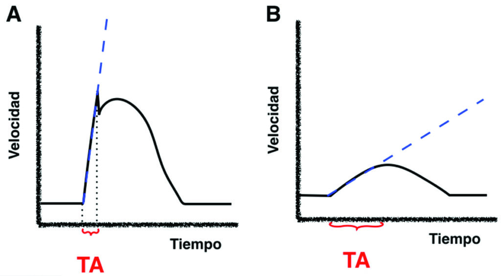 Cuando IR es <0,60, es sugestivo de estenosis de la arteria renal. El TA corresponde al tiempo que transcurrido desde diástole final hasta el primer pico sistólico y se diagnostica estenosis en el caso de que el resultado sea >0,90 seg (Fig. 2, Fig. 3).