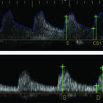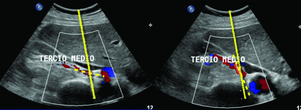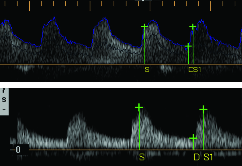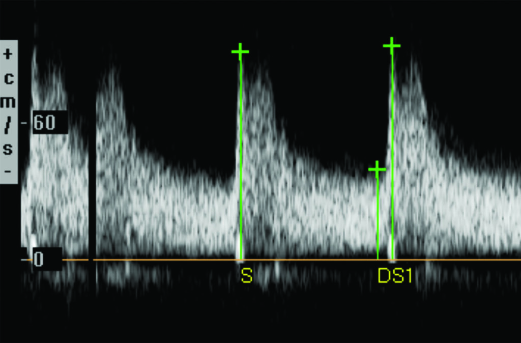 A. Velocidad del pico sistólico es la determinación de la velocidad máxima del flujo sanguíneo durante la sístole. Utilizando como criterios de estenosis los descriptos en la Tabla 1. Compartimos dos casos (Fig. 5, Fig. 6), con mediciones normales y patológicas.