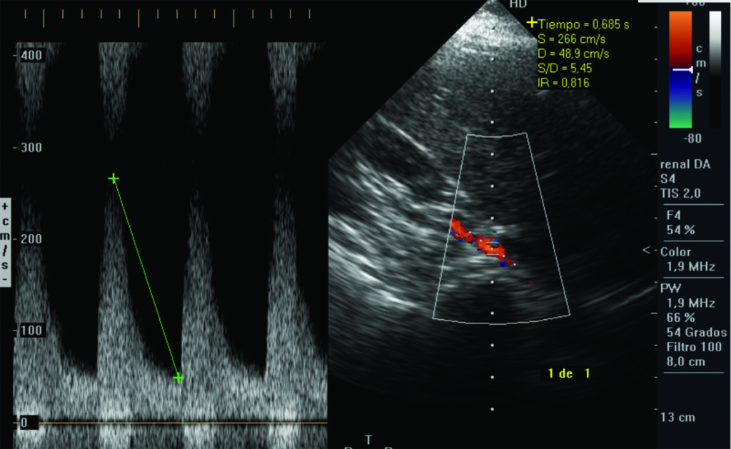 Habitualmente se puede obtener un espectro de onda para el análisis de la velocidad del pico sistólico en el 92% de los casos. En el 8% restante, la arteria renal se visualiza parcialmente.