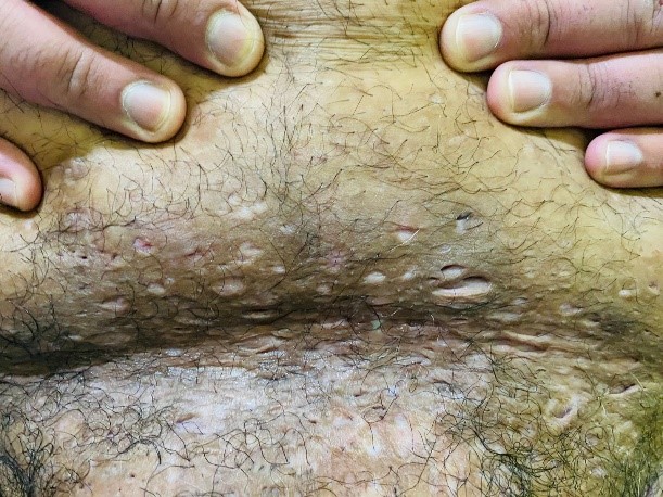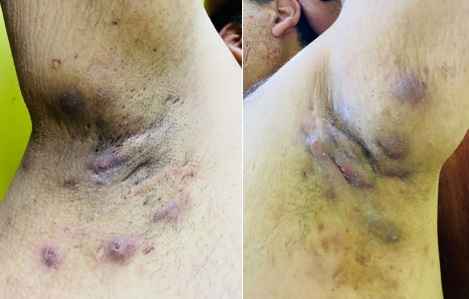 Se presenta el caso de un paciente masculino de 45 años, con antecedentes de obesidad mórbida, gangrena de Fournier (2012), hidradenitis supurativa de 15 años evolución, quien realizó múltiples tratamientos, fue tratado con adalimumab y antibióticos vía oral. Al examen físico presenta pápulas, pústulas, múltiples nódulos abiertos y cerrados localizados en cara, cuello, axilas, pliegues inguinales y perineales, con drenaje de material seropurulento, lesiones cicatrizales en las mismas zonas y úlceras en actividad en cara externa de ambas piernas. El diagnóstico de hidrosadenitis supurativa se realiza con la inclusión de estos tres criterios clínicos: