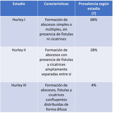 El método de Hurley modificado es una nueva clasificación que incluye la evaluación de la presencia de trayectos fistulosos, el grado de inflamación y la extensión, le permite al médico evaluar la gravedad en los diferentes fenotipos de HS y ayuda a adecuar el tratamiento. Este método reconoce que los pacientes clasificados como Hurley I-II originales pueden ser considerados dentro de estadios graves, además se redefine Hurley III como pacientes con afectación del 1% de la superficie corporal y tractos fistulosos inflamatorios intercomunicados. Estas modificaciones ayudan en el momento de elegir la opción terapéutica más adecuada, sea esta terapia antiinflamatoria, cirugía, o terapias biológicas, incluso permite considerar graves a pacientes Hurley I, siendo también útiles para reconocer cuando la cirugía no es conveniente.