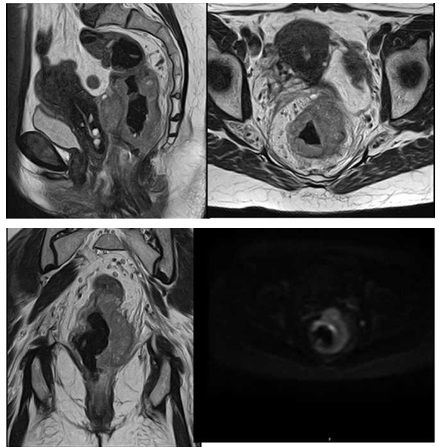 Resonancia magnética: es un examen imagenológico en el que se usan imanes y ondas de radio potentes para poder observar diferentes imágenes del cuerpo, dependiendo de la zona que necesita de imágenes para confirmar o desechar un diagnóstico o sospecha de padecimiento de una enfermedad. La resonancia magnética rectal es la modalidad de imagen preferida para la estadificación local del cáncer de recto, ya que ayuda al radiólogo a describir la ubicación y la morfología del tumor, proporcionar sus categorías T y N, detectar la presencia de invasión vascular extramural, e identificar su relación con las estructuras circundantes, incluido el complejo de esfínteres y afectación de la fascia mesorrectal, además de la reestadificación después de la quimiorradioterapia neoadyuvante, es decir, la respuesta al tratamiento.(20)