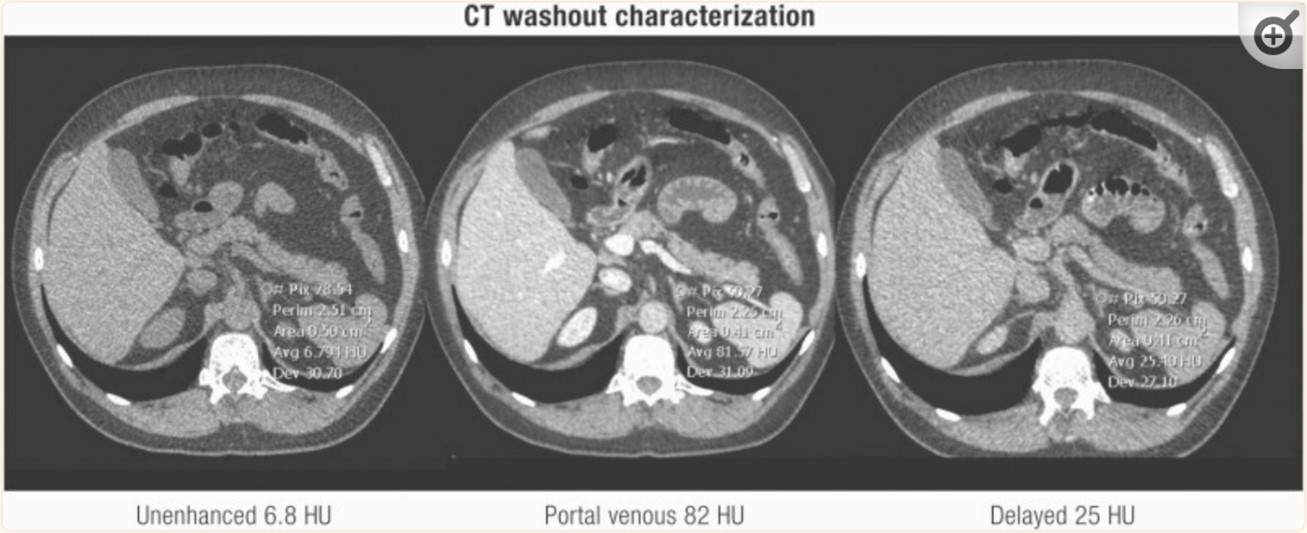 Valores absolutos de lavado de >60% se obtienen con la siguiente fórmula: (UH contraste temprano – UH contraste retardado)/( UH contraste temprano – UH sin contraste) × 100% sugieren un adenoma benigno.(14,18)
