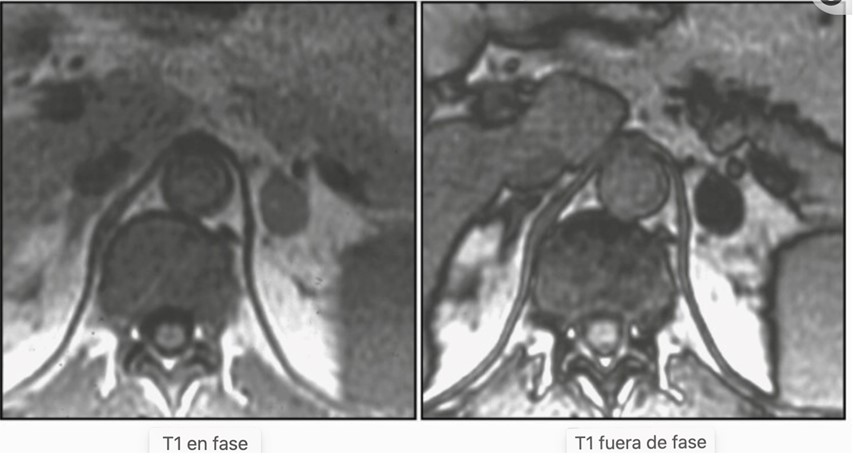 Los adenomas suprarrenales con un alto contenido de lípido intracelular generalmente pierden intensidad de la señal en las imágenes fuera de fase en comparación con las imágenes en fase, mientras que las lesiones malignas y los feocromocitomas (pero también algunos adenomas suprarrenales pobres en lípidos) que carecen de lípido intracelular permanecen sin cambios y conservan su señal.(22)