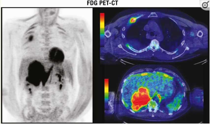 Es una modalidad de medicina nuclear que proporciona imágenes tomográficas cuantitativas después de la inyección intravenosa de un radiotrazador emisor de radiación beta más (positrón) (18-flúor) utilizado para etiquetar la 2-desoxi-D-glucosa que renderiza Fluoro-Desoxiglucosa ([18F]FDG). Tanto la glucosa como la desoxiglucosa entran en las células a través de transportadores de glucosa transmembrana y se someten a fosforilación, pero mientras que la glucosa sufre una mayor descomposición enzimática, la desoxiglucosa queda atrapada en los compartimentos intracelulares. Las células cancerosas tienen una mayor necesidad de glucosa y, por lo tanto, ingieren más glucosa y desoxiglucosa que las células normales. Sin embargo, la FDG no es un marcador específico para las células cancerosas, sino solo un marcador para aumentar el metabolismo de la glucosa. Por lo tanto, la absorción también puede aumentar en las células con un mayor requerimiento de energía debido a condiciones distintas del cáncer, por ejemplo, la infección activa.