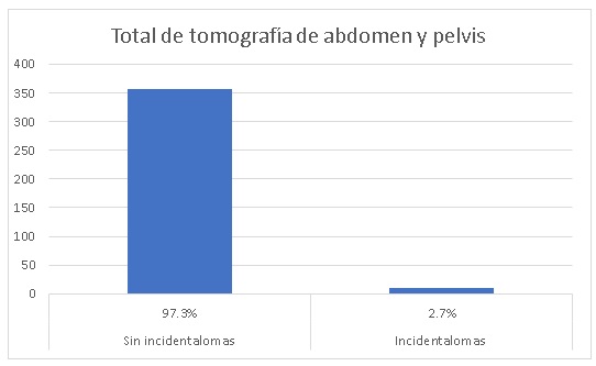Se realizaron 366 tomografías de abdomen y pelvis, de las cuales 10 presentaron incidentaloma, que corresponde a un 2,7%, y 356 no presentaron incidentalomas, alcanzando un porcentaje del 97,3%.