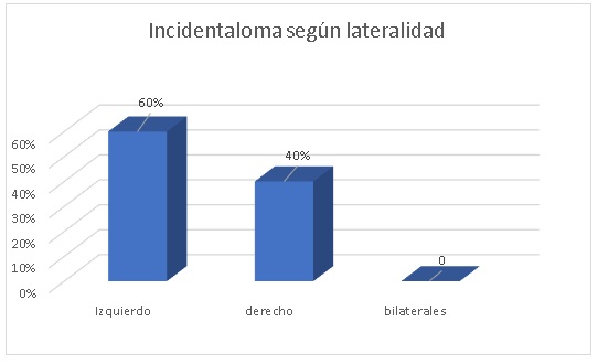 En el siguiente gráfico observamos que, según lateralidad, el lado predominante fue el izquierdo, con un 60%, y el lado derecho alcanzó el 40%; en el presente estudio no se encontraron incidentalomas bilaterales.