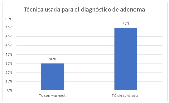 Se observa que el 70% de los incidentalomas suprarrenales fueron catalogados como adenomas utilizando una tomografía computarizada (TC) sin contraste. Esto indica que, en la mayoría de los casos, las características radiológicas de las lesiones permitieron una identificación clara de su naturaleza benigna sin necesidad de procedimientos adicionales. Por otro lado, el 30% restante de los incidentalomas requirió la técnica de TC con lavado para ser catalogados adecuadamente como adenomas.