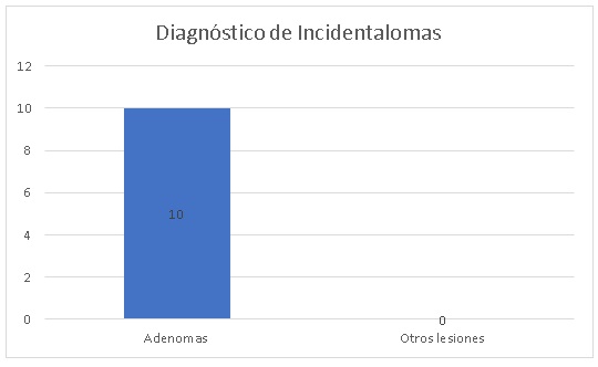 Como se muestra en el Gráfico 7, encontramos que el 100% de los incidentalomas fueron catalogados como adenomas.
