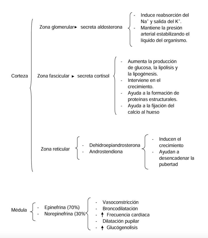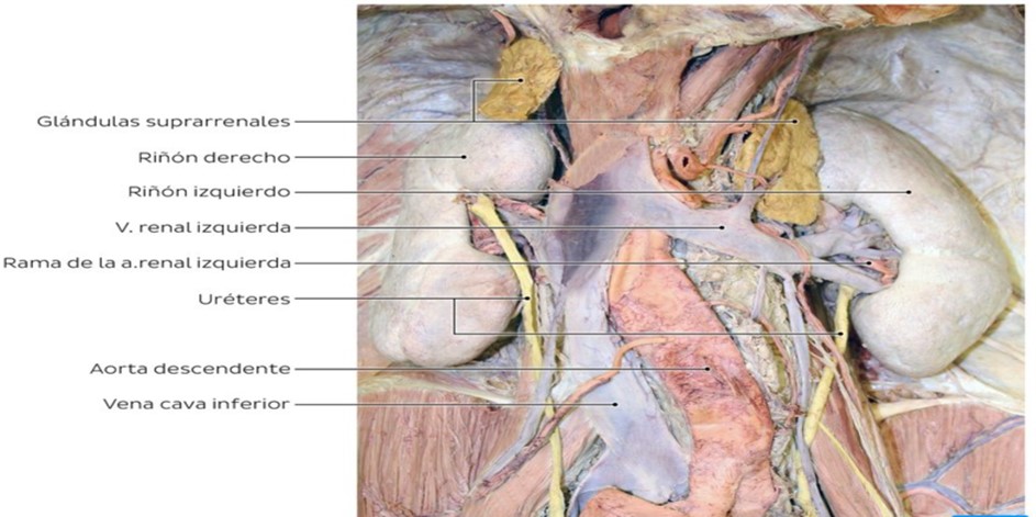 Las glándulas suprarrenales son dos órganos de color mostaza que ocupan una posición superior y un poco medial a los riñones en el espacio retroperitoneal. Tienen un peso de unos 4 gr y su tamaño fluctúa de 40 a 60 mm de longitud, 20 a 30 mm de ancho y 2 a 8 mm de grosor.