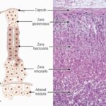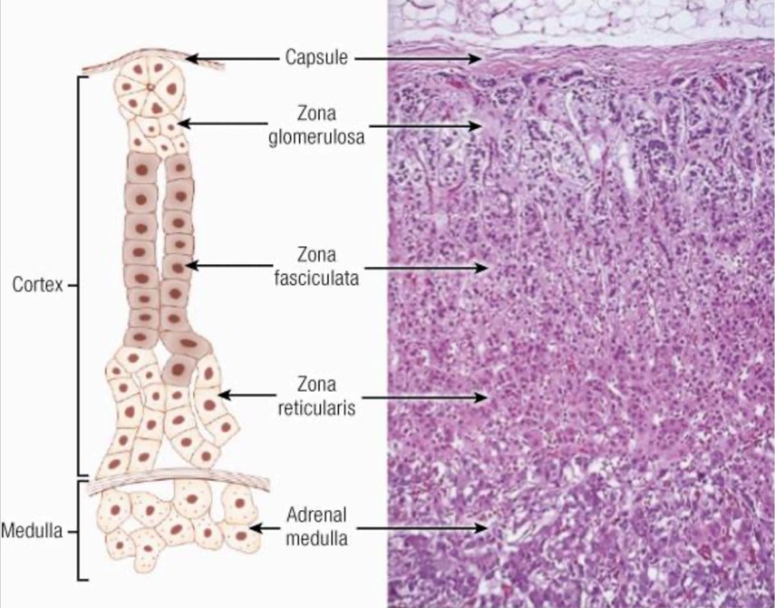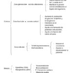 Diagrama esquemático de la estructura de la corteza suprarrenal humana.(8) Adaptado de Stewart, P.M., Capítulo 14, “La corteza suprarrenal”.