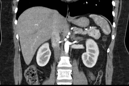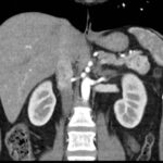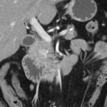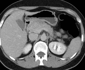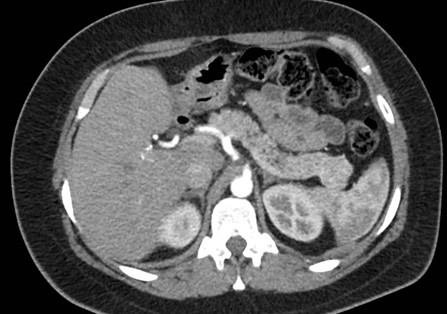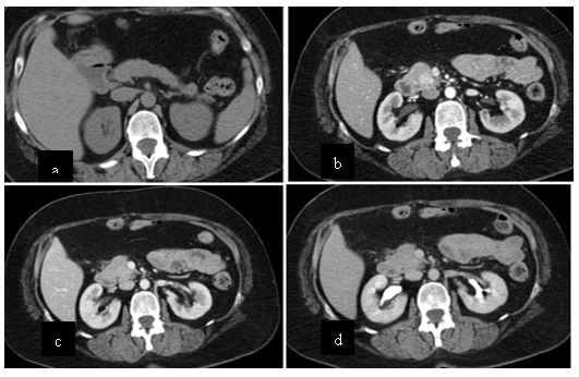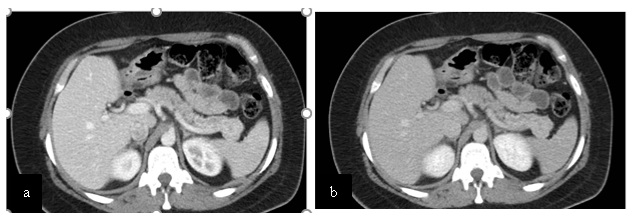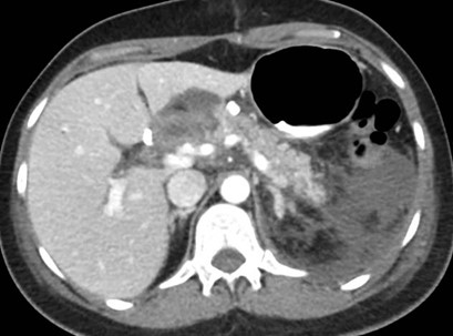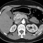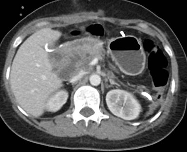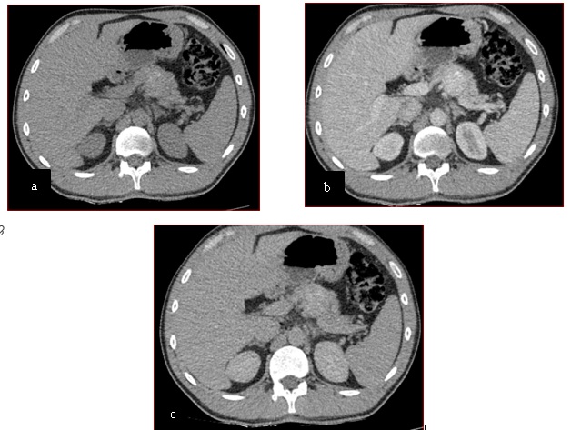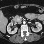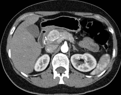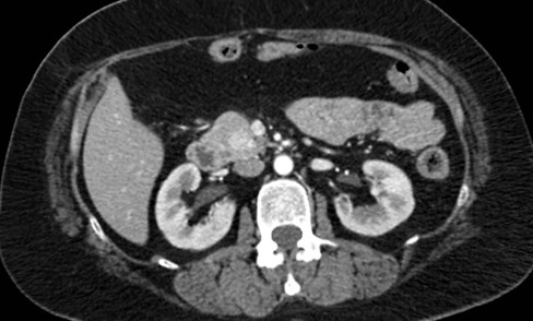 Ahora bien, como se mencionaba al principio, el estudio ecográfico es de muy baja sensibilidad y se identifique o no la lesión por este estudio, nuestro siguiente paso en el algoritmo diagnóstico de esta lesión es la tomografía. Esta es la prueba no invasiva inicial, con una sensibilidad del 63% al 83%, y detecta del 70% al 80% de los tumores. Esta debe realizarse como un estudio trifásico: fase arterial temprana a los 30 segundos, fase venosa a los 70 segundos, fase tardía de 3 a 5 minutos. La característica de estos tumores por tomografía es que se presentan como una masa sólida que tiene un ávido realce en la fase arterial, cuyo realce se mantiene y se observa más tenue en la fase venosa y en los tiempos tardíos la lesión se homogeniza.