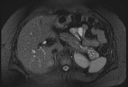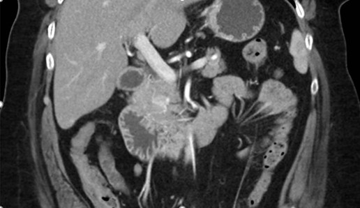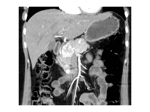 Mujer de 36 años que ingresa a Hospital Sanatorio Franchin el 11 de octubre de 2023 de forma programada para realización de duodeno pancreatectomía cefálica por tumor de cabeza de páncreas en estudio. Refiere hallazgo de lesión en forma incidental durante estudio de control hace dos meses por presentar antecedentes familiares (neoplasia endocrina múltiple). Se interna para manejo quirúrgico. Estudios de tomografía revelan formación nodular localizada en cabeza y cuerpo pancreático de paredes gruesas que mide 24 x 28 mm, que en resonancia se muestra hiperintensa en T2 y realce periférico luego de la administración de contraste endovenoso. Presenta restricción en la difusión con caída de la señal ADC, por lo que se vincula con una lesión de alta celularidad.