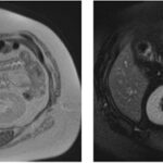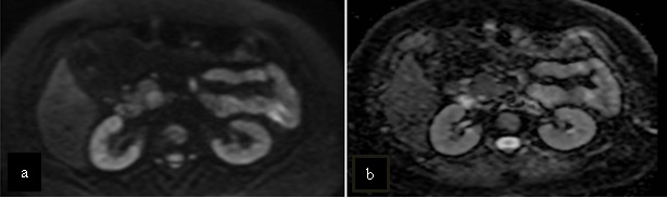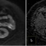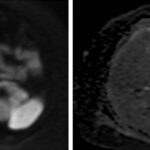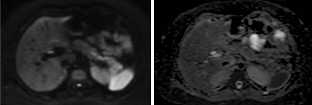 La resonancia magnética confirmó aún más el diagnóstico de las lesiones ya previamente visualizadas en tomografía en esta revisión, con realce de las lesiones en secuencias T1 y contraste con gadolinio, y en las secuencias funcionales con restricción de la lesión y caída de la señal en el mapa de ADC.
