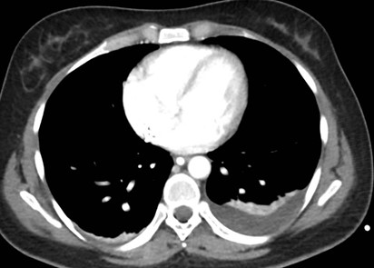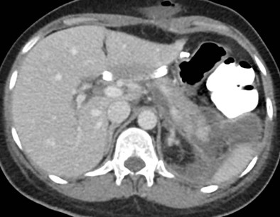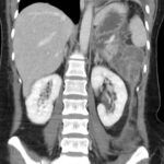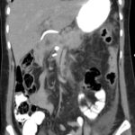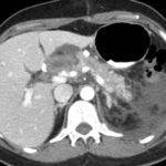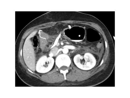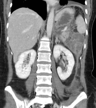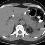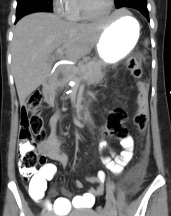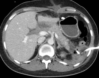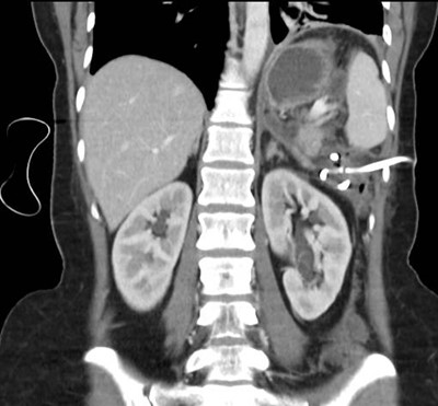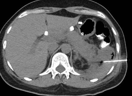 Paciente que se intuba y pasa a UTI, posteriormente extubación exitosa. El 22 de octubre se complica con colección abdominal, por lo cual requiere de drenaje percutáneo guiado por TC.