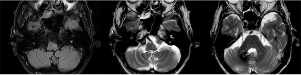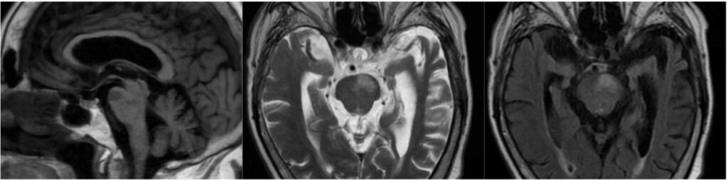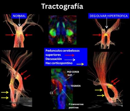 El compromiso estructural observado corresponde a una alteración del circuito dentato-rubro-olivar, cuyo daño es un mecanismo bien reconocido en la génesis de la degeneración olivar hipertrófica (DOH). En este contexto, la hiperintensidad de la oliva inferior en secuencias T2/FLAIR constituye el hallazgo imagenológico cardinal, permitiendo el diagnóstico incluso en ausencia de cambios volumétricos evidentes en fases iniciales.