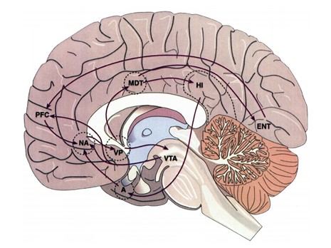 Como se ha indicado, las drogas de abuso incrementan la actividad eléctrica de las neuronas dopaminérgicas del VTA y la liberación de dopamina en sus campos de proyección, como en el shell del núcleo accumbens.(8) Asimismo, las neuronas dopaminérgicas se proyectan hacia otras estructuras del sistema límbico, donde hay archivos de memoria que sirven como reforzador de la autoadministración y por ende optimizan la consecución de una futura recompensa.(9)