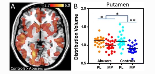 La mayoría de los estudios clínicos vinculados con las adicciones se centran en analizar las áreas de dopamina del mesencéfalo, principalmente el área tegmental ventral y la sustancia negra, así como las estructuras de los ganglios basales, como el estriado ventral (donde se encuentra el núcleo accumbens) y el estriado dorsal, en cuyas áreas se activan los circuitos de recompensa, el acondicionamiento o adaptación y la formación del hábito de adicción.(7)