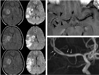 En los casos de personas sin patología vascular subyacente, las hemorragias intraparenquimatosas se localizan con mayor frecuencia en los ganglios basales y el tálamo. Un caso como este se obtuvo en la literatura, correspondiente a una mujer de 23 años que sufrió una hemiplejía completa. Se le localizaron cantidades considerables de cocaína en el análisis de orina. La RM evidenció una isquemia en la rama MCA derecha con afectación de los ganglios basales(17) (ver Imagen 7).