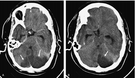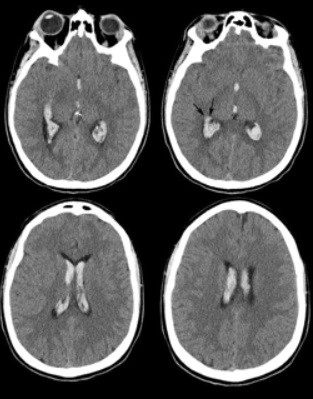 En relación con este tipo de drogas, se puede citar el reporte de un caso de intoxicación de un varón de 16 años por consumo de píldoras de oxicodona. La TC permitió visualizar la hipodensidad en núcleos caudados, así como una rabdomiólisis de etiología inflamatoria o infecciosa (ver Imagen 14). El paciente presentó otros signos como escasa coordinación, pérdida de conocimiento y dificultad para respirar, que se resolvió en pocos días con intubación y asistencia ventilatoria.(23)