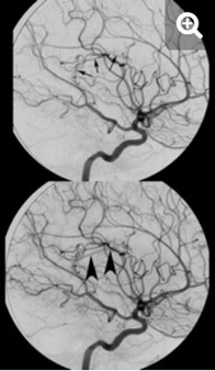 Otro caso que conviene referir es el de una mujer de 19 años, quien acudió al servicio de guardia por dolor de cabeza agudo. Se le realizó una TC que mostró una hemorragia intraventricular con un posible componente parenquimatoso cerca de la pared del ventrículo derecho, a partir del abuso de cocaína en combinación con alcohol (ver Imagen 8). De igual modo, la angiografía evidenció una malformación arteriovenosa coroidea alimentada por la arteria coroidea lateral posterior(17) (ver Imagen 9).