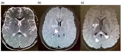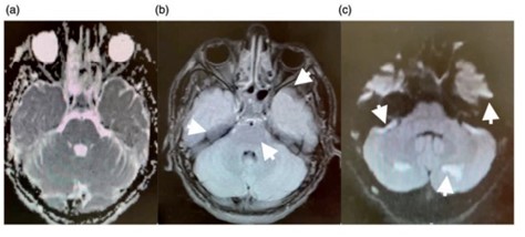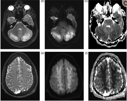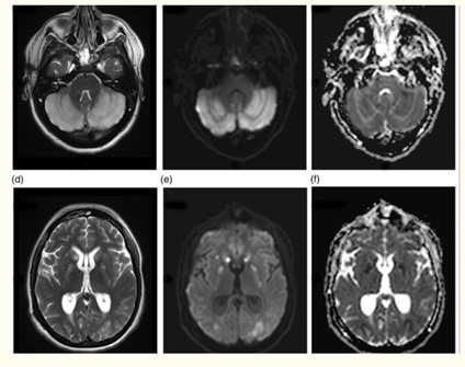 En el caso que se viene ilustrando, la RM mostró T2 difuso con hiperintensidades en el cuerpo calloso bilateral frontal y parietal, así como lesión difusa de la sustancia blanca del cerebelo. Se localizaron áreas de difusión restringida en los ganglios basales bilaterales, lo cual tenía relación con la pérdida neuronal mediada por estrés oxidativo (ver Imágenes 15 y 16). El tratamiento permitió la recuperación progresiva del habla y la orientación de la persona. (23)