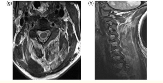 En esta investigación que se viene señalando, se puede mencionar el caso de un joven de 16 años, con alteración aguda del estado mental por inhalación de vapor de heroína. Se le efectuó una RM que evidenció hiperintensidades en T2 de la sustancia blanca simétrica difusa infratentorial y supratentorial. El diagnóstico clínico en este caso fue rabdomiólisis, que afecta predominantemente la musculatura posterior del cuello(21) (ver Imágenes 11 y 12).