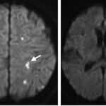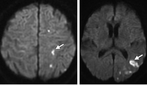 Los estudios de TC permiten evidenciar los accidentes cerebrovasculares (ACV) ocasionados por el abuso de la cocaína. Por caso, se localizó en la literatura imágenes que permiten ver el ACV isquémico agudo de la arteria cerebral media izquierda de un paciente. La TC sin contraste intravenoso visualiza la hipodensidad de la cabeza del caudado, del núcleo lenticular y de la ínsula izquierda. También se realizaron estudios de RM, que permiten observar la restricción del área isquémica en el territorio silviano(18) (ver Imagen 5).