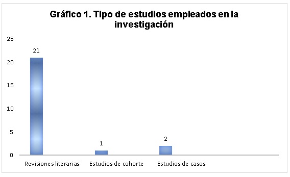 En esta investigación se utilizaron 24 estudios de carácter científico y académico encontrados en bases de datos especializadas y confiables, como PubMed, Medline, Scielo, Dialnet, Seram (Sociedad Española de Radiología Médica) y Google Scholar. Las investigaciones incluidas se correspondieron mayormente con revisiones bibliográficas sistemáticas o estudios teóricos, estudios de cohorte y reportes de casos (ver Gráfico 1).