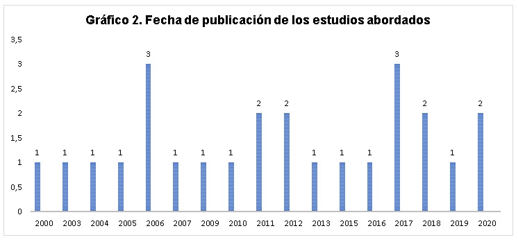 En relación con los años de publicación, la mayoría de los estudios se correspondieron con estudios no superiores a diez años, pero se consideraron algunos de mayor antigüedad por su relevancia teórica y aportes a esta investigación (ver Gráfico 2).