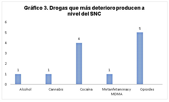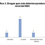 En relación con las drogas de abuso que más daño producen a nivel del SNC, los estudios reportaron con mayor frecuencia el alcohol, la cocaína, el MDMA y las metanfetaminas y los opioides como los tipos de sustancias ilegales que más problemas estructurales generan a nivel cerebral. Estas también se señalan como la causa primordial de eventos embólicos, vasoespasmos, hemorragias subaracnoideas, isquemias y demás eventos vasculares (ver Gráfico 3).