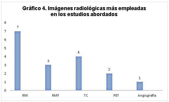Asimismo, los estudios radiológicos más empleados en los estudios analizados para la detección y diagnóstico de lesiones en el cerebro del adicto se corresponden con la resonancia magnética (RM), la resonancia magnética funcional (RMf) y la tomografía computada (TC) (ver Gráfico 4).