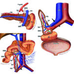 El conocimiento del método quirúrgico y la anatomía radiológica posquirúrgica es fundamental para el seguimiento y el diagnóstico de las complicaciones. Es indispensable conocer la reconstrucción arterial que implica la anastomosis de la arteria esplénica y la arteria mesentérica superior del donante con la arteria ilíaca común o externa del receptor mediante un injerto de extensión en “Y” de la arteria ilíaca del donante. El drenaje venoso sistémico implica la anastomosis de la vena portal del donante con la vena ilíaca del receptor (Fig. 1) (1).