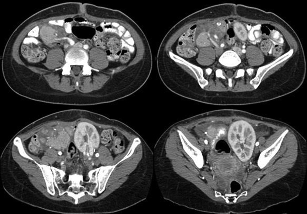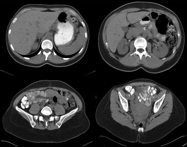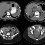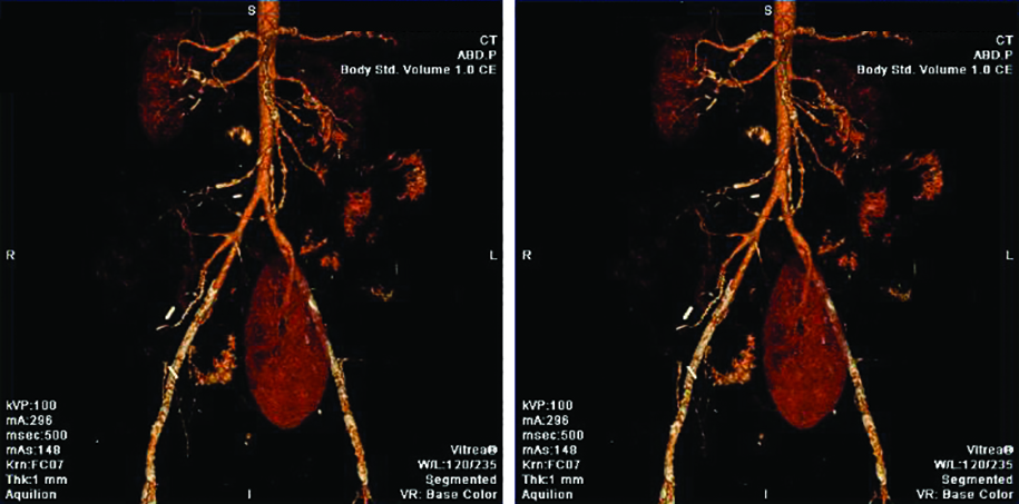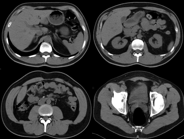 Paciente de sexo femenino de 38 años de edad, con diagnóstico de diabetes tipo 1, sin antecedente de hemodiálisis previo. Se le realizó tomografía de abdomen y pelvis simple preoperatoria para descartar calcificaciones vasculares, posible causal de complicaciones en las anastomosis de los órganos a trasplantar con las arterias iliacas (Fig. 4). No presentaba alteraciones significativas en el sistema vascular.