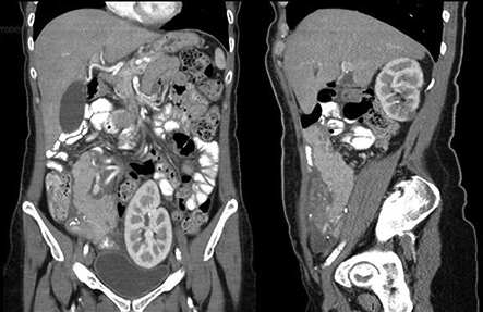El contraste EV es importante para la detección y la evaluación de las complicaciones vasculares (angioTC) y para la documentación de la necrosis pancreática, que es la fase terminal de la lesión isquémica de la glándula. Se pueden hacer reconstrucciones en 3D que son muy útiles para el análisis conjunto con los cirujanos tratantes (Fig. 3) (3).