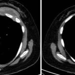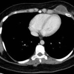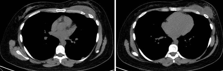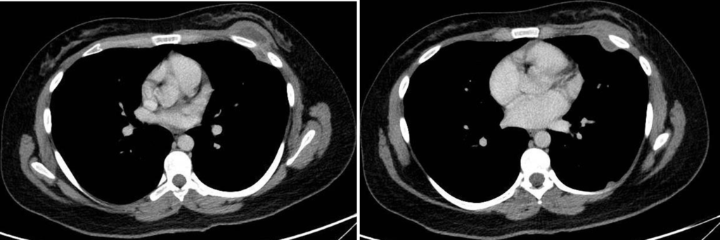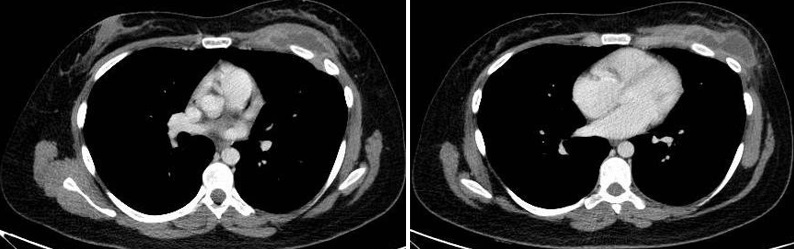 Cuatro meses posteriores a la PAAF la paciente refiere persistencia de dolor y aumento de tamaño de la masa asociado a eritema en región mamaria, por lo cual se realiza TC de tórax con contraste EV donde se observa imagen hipodensa ya conocida, con realce periférico tras la administración de contraste, con aumento de tamaño y bordes lobulados.