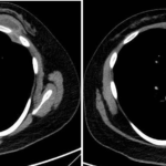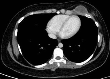 Paciente femenina de 26 años de edad, sin antecedentes patológicos de relevancia, sin dosis de vacuna BCG. Cursa con cuadro clínico de ocho meses de evolución, caracterizado por dolor en región pectoral izquierda intermitente, que se exacerba a la inspiración profunda. En el último mes se palpa masa indurada dolorosa a la palpación a nivel del cuadrante inferior interno de mama izquierda, motivo por el cual se realiza ecografía de partes blandas, donde se observa a nivel retropectoral en íntimo contacto con la parrilla costal imagen hipoecogénica de bordes delimitados, avascular al Doppler color por lo cual se solicita TC de tórax con EV. En ella se observa en topografía del cuarto espacio intercostal, imagen hipodensa con realce periférico tras la administración del contraste que desplaza por efecto de masa el parénquima pulmonar adyacente y se proyecta a la pared torácica anterolateral izquierda; mide 40 mm x 55 mm. Además, se visualiza otra imagen de similares características de base pleural en contacto con el octavo arco costal posterior izquierdo que mide 6 mm x 11 mm.